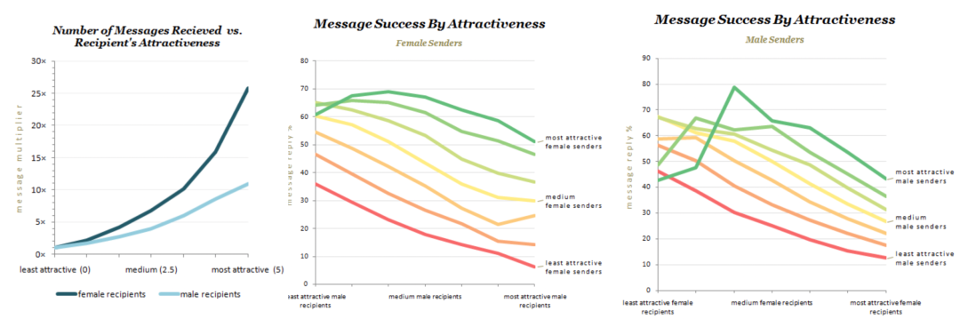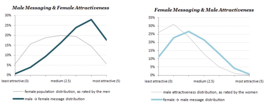 在电商、内容等领域,一个商品、短视频可以海量地分发给各个用户,但是在社交特别是交友领域,这肯定是不行的,道德问题和双向匹配满意度问题都限制了分发的有限性。每个用户作为供给,只能完成一定次数的被匹配 ( 而且这个次数一般不会大 ),同一人能与多人匹配并聊天,但是一般只能与一人成为男女朋友谈恋爱。如果不考虑道德问题,用户的交际带宽也是有限的,无法做到人人有反馈 ( 例如在探探中发现有个女生在几天之内被喜欢了30w次 )。优质用户也只能提供有限的供给,这和书籍或者商品很不一样,并不是只要有库存就可以同时推荐给很多用户。美女帅哥在平台上从来不缺被喜欢,很容易成为产品的头部用户,他们也可以为产品吸引更多的用户进来;如果我们过度推荐这些用户可能会让这些用户收到到上万个喜欢的轰炸,但他们无法提供高的反馈率,比如下图中的头部用户拿到了几倍于普通用户的喜欢,但是回复率和匹配率却是颜值一般的人的五分之一水平 ( 来自于OkCupid Blog )。