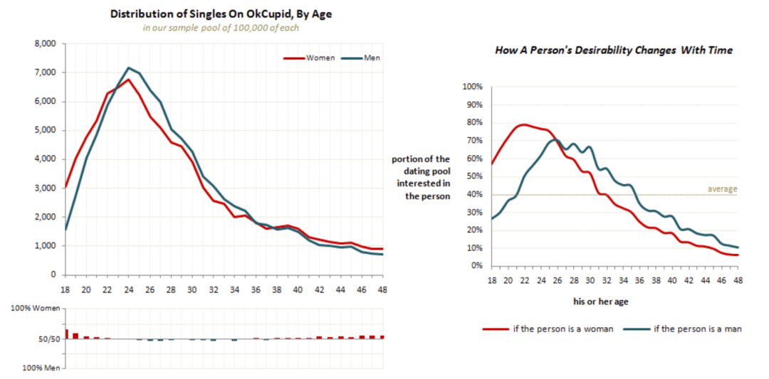 在OkCupid的数据来看 ( 下左图 ),陌生人社交的人群集中在24岁附近,30岁后急剧下降,最后逐渐减少,因为其余的单身人士要么找到伴侣,要么退出了竞争。当然这中间男女吸引力的下降也有区别,比如女性吸引力的峰值出现在31岁,男性则出现在36岁。