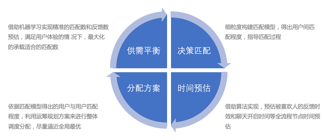 使用智能系统需要做双向概率预估,通过将A对B和B对A的喜欢概率进行预估,并相乘计算匹配成功率;由于反馈及时程度往往也较大地影响了这个用户的留存,所以在给用户匹配其他可能Ta喜欢的人时,我们需要在匹配计算公式中加入对方未来活跃(活跃时间间隔预估)并回复的概率,并作为因子影响匹配成功率。比如对实时在线的用户给予优先权(因子分数高),让反馈速度提升。并且我们在展示层引入供需关系,并通过冷热预估、投放策略(贪心、概率、bandit等)来进行控制。