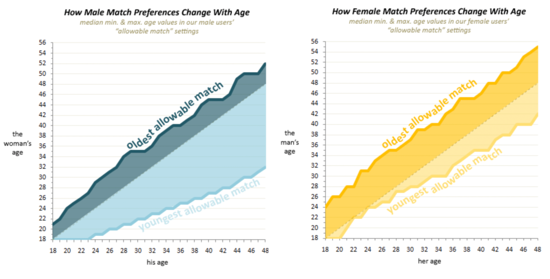 男性往往随着年龄的增长可以接受越大的年龄下限,而上限基本维持;女性则基本维持这个上下限,见下图 ( 来自于OkCupid Blog )。
