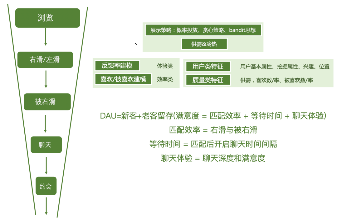 可以看到Tinder从三个维度来看分别为Activeness ( 新账户数量、使用时长、每日访问次数、每次匹配完成后的对话频率 )、Pickiness ( 右滑率、喜欢率 )、Attractiveness ( 被喜欢率、信息被点击率、信息展示时长 ),其中attractiveness 和pickiness基本可以用户推荐的当下可预估,做起来比较简单,activeness就需要考虑宏观匹配、调控及长期规划了。
