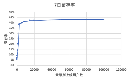 互联网的本质就是一张信息网络,互联网产品普遍具有网络效应,而社交类产品则更加依赖于网络效应,边际成本下降明显,边际收益上升明显。那某个社交产品如何评估网络效应的强弱,或者说达到多少才是合适的呢。前两天跟一个朋友交流陌生人社交,他们有一个观点就是在可互动 ( 比如基于LBS的产品,可互动指的是距离不能大于某个值 ) 的用户每日用户数需要达到2000以上,7日留存在40%以上,这个产品是初具网络效应的,值得投入持续拉新最大的 ( 当然上述2000和40%会被具体产品的用户活跃情况、性别比例、产品特性决定 )。比如可以分析每个区块 ( 比如同城 ) 中人数对整体活跃度的影响,最终可以画出如下的图表,随着用户增长,拐点会出现 ( 拐点可能就是magic number ),规模临界点前后的差异巨大。当然下图需要在用户体量增加时做好匹配,不然用户量的上升可以使体验下降,继而带来留存的下降。