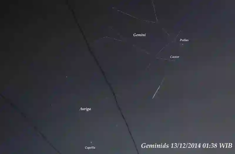 2017年12月初 Martin Marthadinata在印度尼西亚爪哇岛东的泗水上传了这张照片。他写道:“再过几天双子座流星雨就到极大值了(12月13日—14日)。2014年的时候,我拍到一颗从北河二附近的辐射点飞出来的火流星,实在是太震撼了!”