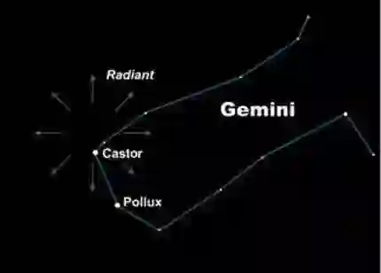 流星雨的辐射点几乎与双子座中明亮的北河二重合。当然这只是视角上的机缘巧合,因为北河二距离我们大约52光年远,而这些流星在高层大气层中燃烧,距地球表面只有约100公里(60英里)。