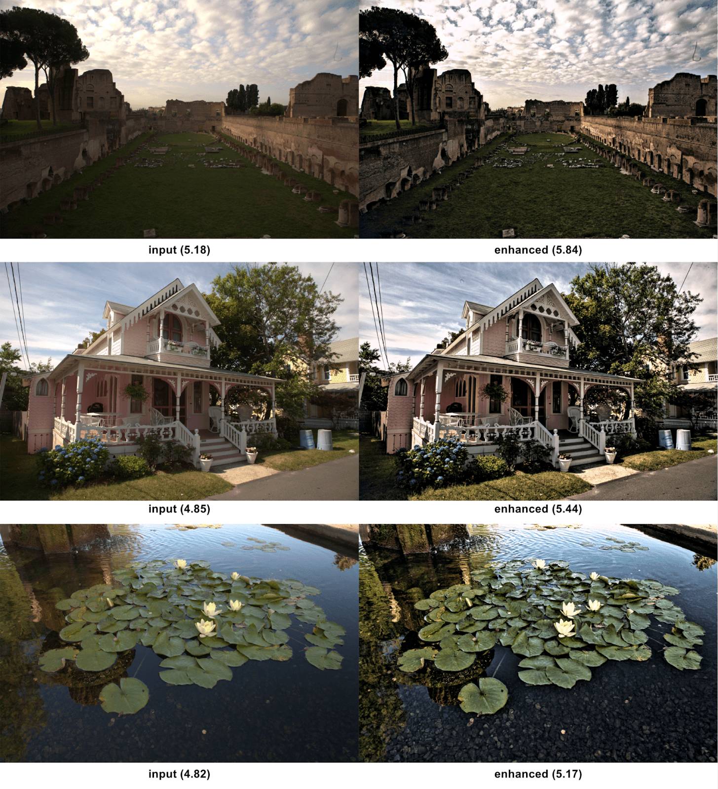 正如我们在另一篇论文中所提到的,质量和吸引力分数也可以用来调整图像增强operators。换句话说,将NIMA分数最大化作为损失函数的一部分,能够提升图像增强的感知质量。下图中的例子表明,NIMA可以作为训练损失来调整色调增强算法。我们发现对美感的基准评分可以通过NIMA的评分指导的对比调整来改善。因此,我们的模型能够引导一个深度卷积神经网络滤波器,以找到参数中接近最佳设置的位置,例如亮度、高光和阴影。
