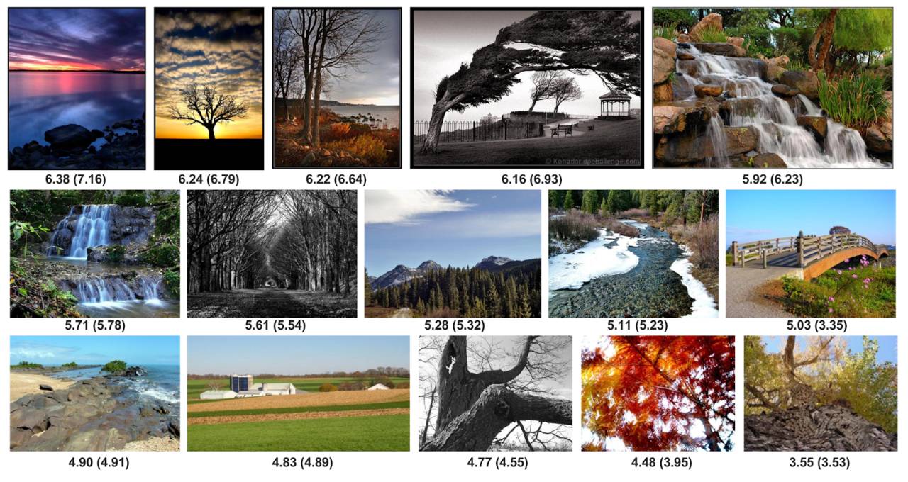 AVA中带有“风景”标签的图片排名。括号中是人类打分,括号外是NIMA的预测分数
