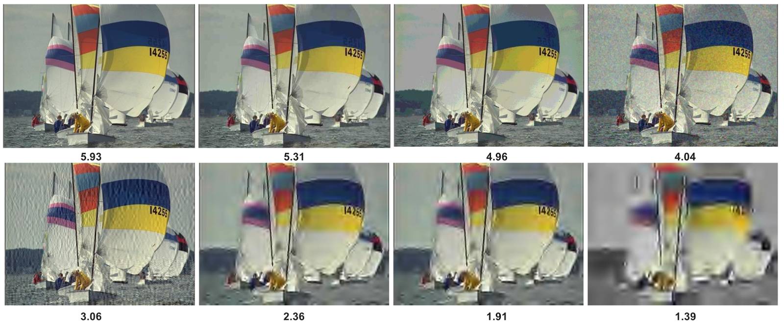 NIMA的分数也可以比较经过扭曲的图片与原图的质量差别,以下是TID2013测试集的一部分,其中包含各种类型和级别的图像失真。