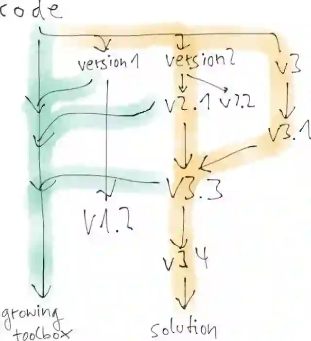 正如我上文所说,数据科学家也会编写大量代码,但这些代码常常是为了探索和尝试新的想法。所以,你可能会先开发出一个1.0版,但并不太符合你的预期,接着便有了2.0版,进而产生2.1和2.2版。然后你放弃了这个方向,又做出了3.0和3.1版。这时你意识到,如果把2.1版和3.1版的一些想法结合起来,就能得到更好的解决方案,因此有了3.3和3.4版,这便是最终的解决方案。