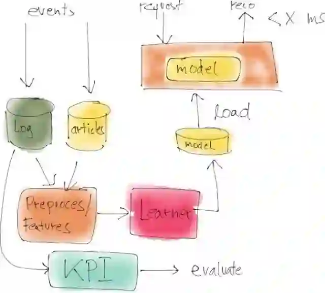 开发系统和数据科学系统之间的最主要区别可能在于,开发系统是持续运行的实时系统。数据必须得到处理,模型必须不断更新。输入事件也常常被用来计算点击率等关键绩效指标。模型经常每隔几小时就使用可用数据重新训练一次,然后加载入开发系统中,通过采用REST架构的接口提供数据。