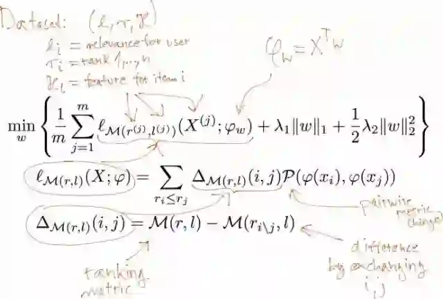 还有更简单的一些方法,基本只通过计数来生成推荐,但在实际操作上,这类方法的复杂度几乎没有上限。例如,就个性化推荐而言,我们一直在研究对从各种角度对商品进行排序的机器学习排名方法。上图显示的是用于优化这一方法的成本函数,主要是为了说明数据科学有时具有的复杂程度。该函数采用包含正则项的对偶加权排名指标。虽然在数学上非常精确,但也非常抽象。这种方法不仅能用于电子商务领域的推荐,还能用于解决各种各样的排名问题,前提是排名对象具备适合的特征。