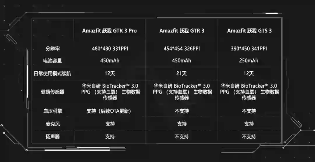 跃我 GTR 3 与 GTS 3 在功能配置方面,基本相同,两者的区别在于手表形态与续航。可以简单理解为 GTR 3 系列更适合男性用户,GTS 3 系列更加轻薄小巧,更适合女性用户。另外 GTR 3 系列还有一款 Pro 版本,采用了更大尺寸的屏幕、表带更换为氟橡胶,内置麦克风和扬声器,最重要的是加入了在今年 7 月份华米技术大会中正式亮相的血压监测功能。