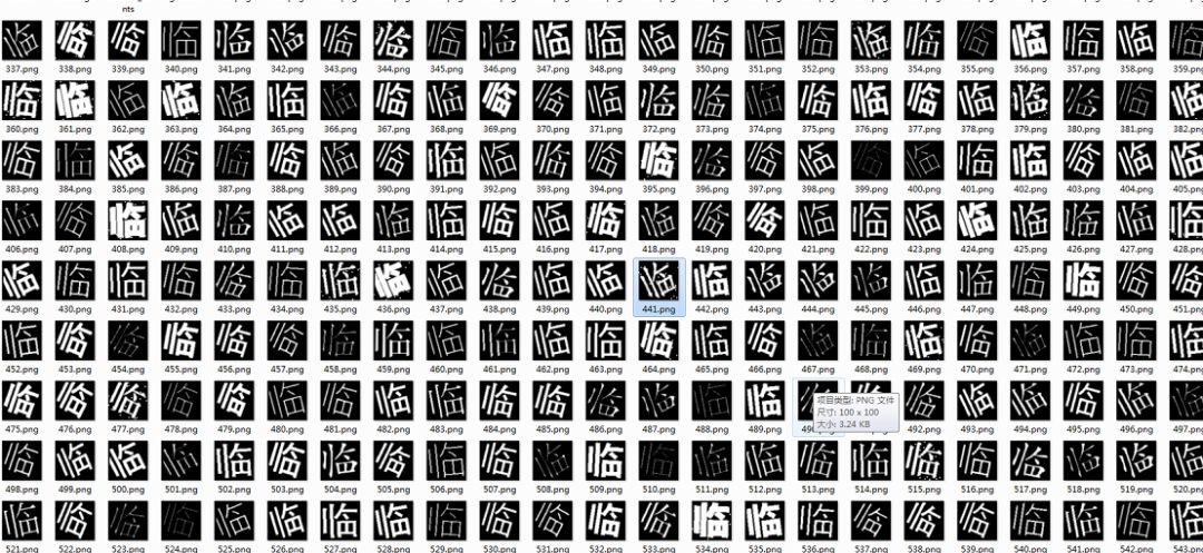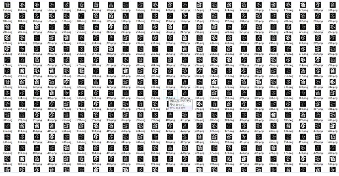 生成这么一个3755个汉字的数据集的所需的时间还是很久的,估计接近一个小时。其实这个生成过程可以用多线程、多进程并行加速,但是考虑到这种文字数据集只需生成一次就好,所以就没做这方面的优化了。数据集生成完我们可以发现,在dataset文件夹下得到train和test两个文件夹,train和test文件夹下都有3755个子文件夹,分别存储着生成的3755个汉字对应的图像,每个子文件的名字就是该汉字对应的id。随便选择一个train文件夹下的一个子文件夹打开,可以看到所获得的汉字图像,一共634个。