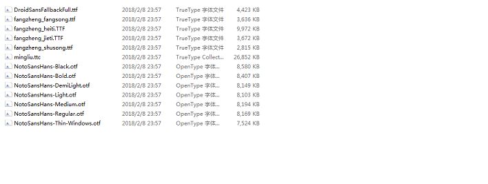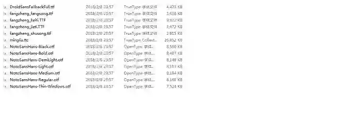 字体文件上网收集就好了,但是值得注意的是,不是每一种字体都支持汉字,所以我们需要筛选出真正适合汉字生成的字体文件才可以。我一共使用了十三种汉字字体作为我们接下来汉字数据集用到的字体,具体如下