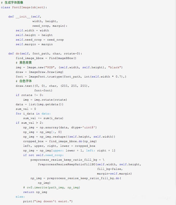 现在说一下字体图像是怎么生成的,首先我们使用的工具是PIL。PIL里面有很好用的汉字生成函数,我们用这个函数再结合我们提供的字体文件,就可以生成我们想要的数字化的汉字了。我们先设定好我们生成的字体颜色为黑底白色,字体尺寸由输入参数来动态设定。