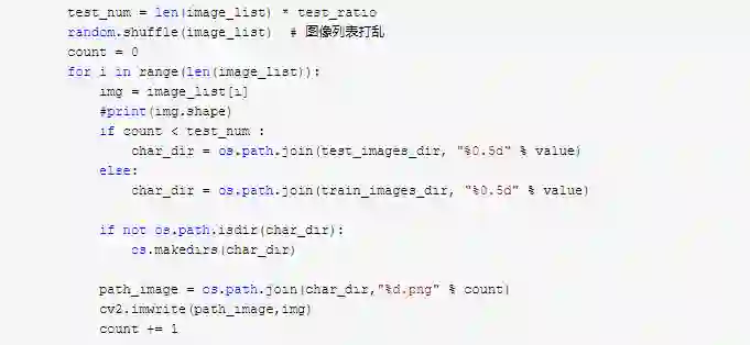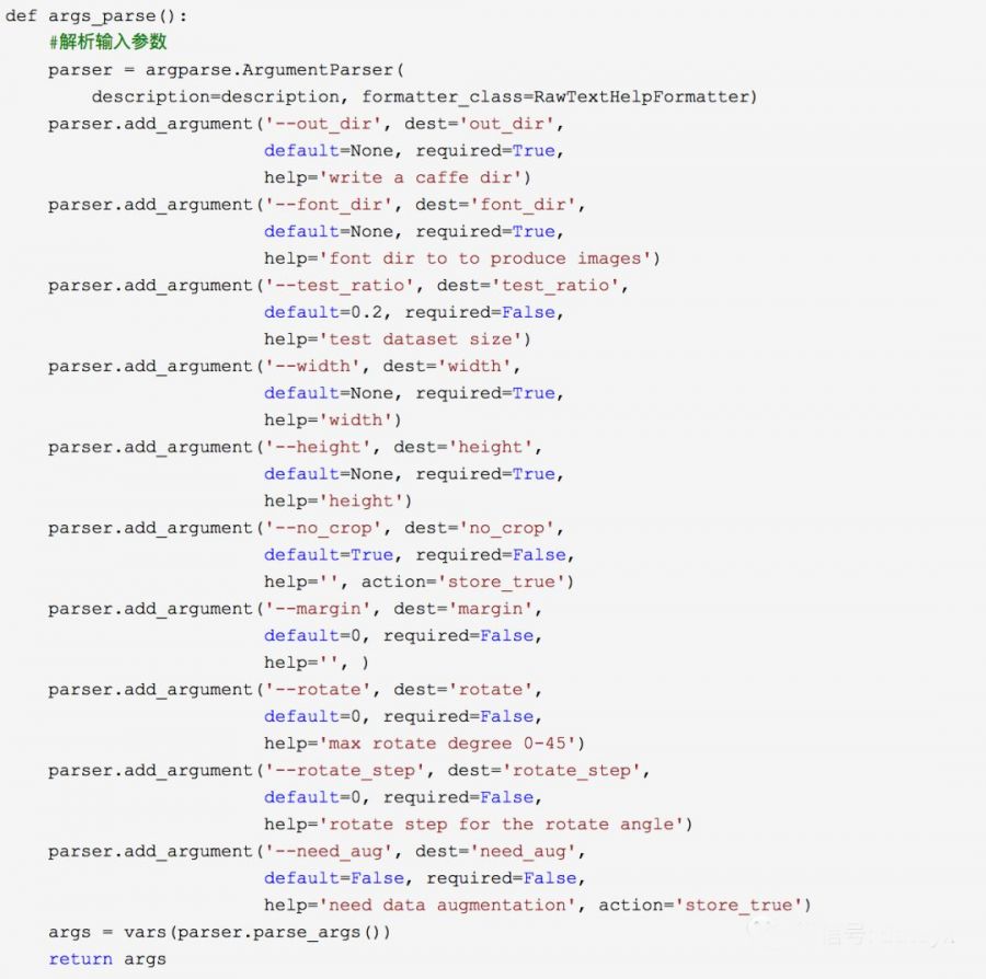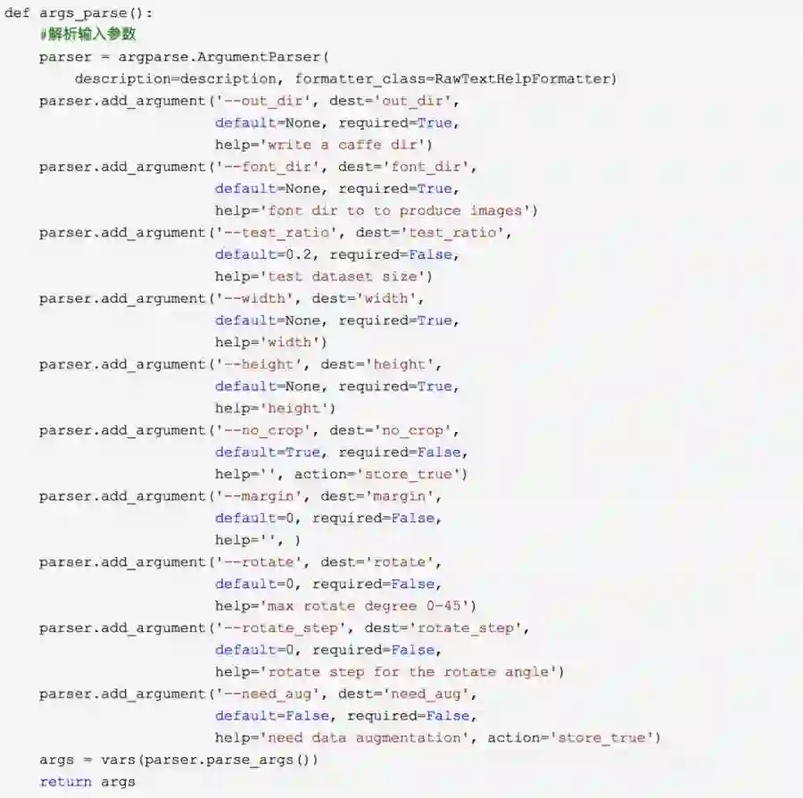 首先是定义好输入参数,其中包括输出目录、字体目录、测试集大小、图像尺寸、图像旋转幅度等等。