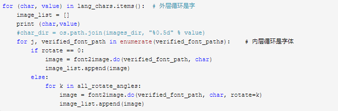 我们写两个循环,外层循环是汉字列表,内层循环是字体列表,对于每个汉字会得到一个image_list列表,里面存储着这个汉字的所有图像。