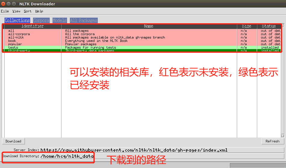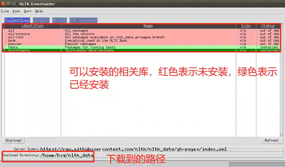 选择下载所有软件包的“all”,然后单击“download”。这将提供所有标记器,分块器,其他算法以及所有语料库。如果空间有限,可以选择手动选择下载所需要的内容。NLTK模块将占用大约7MB,整个nltk_data目录将占用大约1.8GB,其中包括分块器,解析器和语料库。