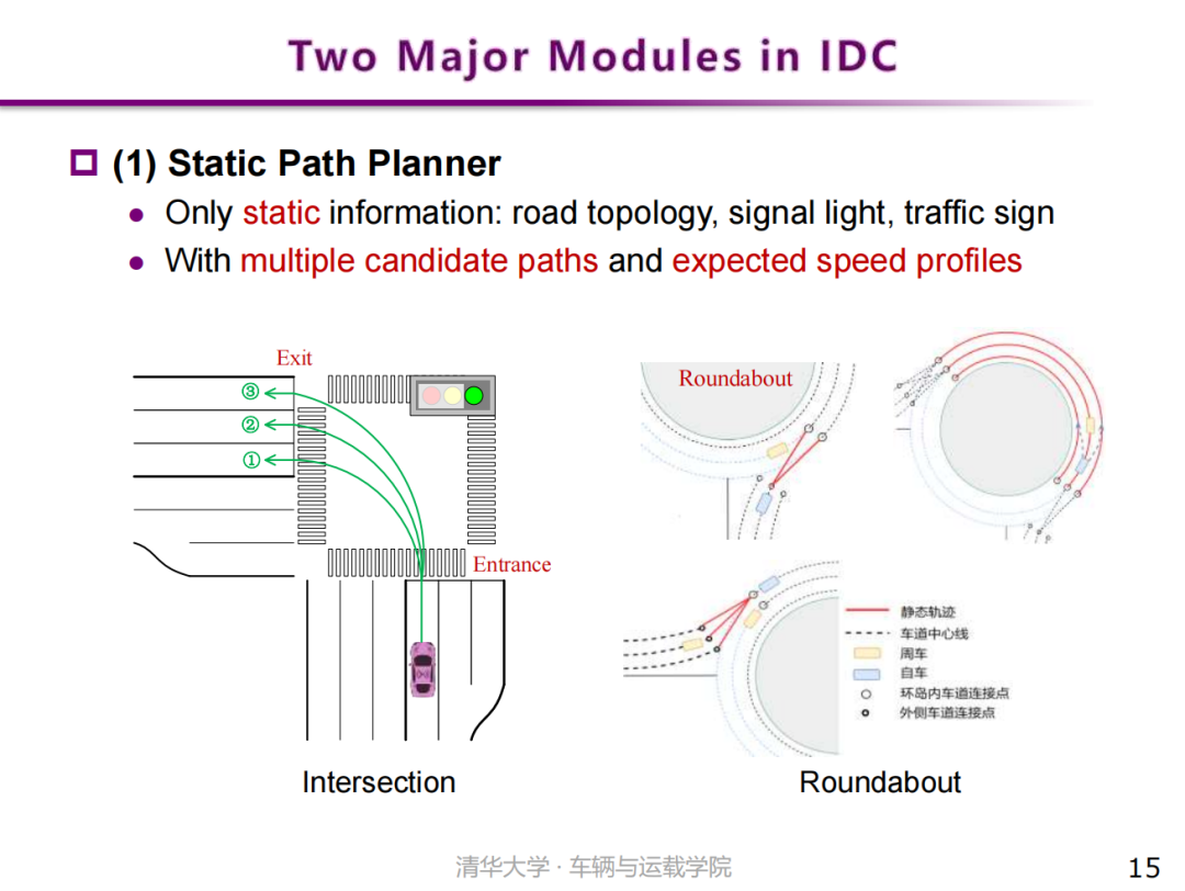 为此,智能驾驶课题组(iDLab)从2018年开始,提出并推动使用一类全新的决策与控制架构,称之为集成式决控架构(IDC,Integrated Decision and Control)。与分层式架构不同,该架构将决策和控制问题整合为一个统一的约束型最优控制问题,仅包含一个性能指标,一个动力学系统,通过强化学习求解一个自动驾驶策略。该架构包含静态路径规划和动态优选跟踪两个模块。静态路径规划仅根据静态道路环境信息(如道路几何结构、路侧指示标识、地面指示标识等,但是不包括红绿灯、交通参与者等信息),给出一套可跟踪的参考路径集合(注意这是一个参考路径的集合,而不是单条最优的参考轨迹)。而动态优选跟踪则构造为一个跟踪参考路径集合的约束型最优跟踪问题,利用强化学习求解该问题,它的值函数(Value function)具有评价不同参考路径性能的能力,实现“自主决策”的功能;它的策略函数(Policy)则输出油门、刹车、方向盘等控制量,具备“运动控制”的功能。