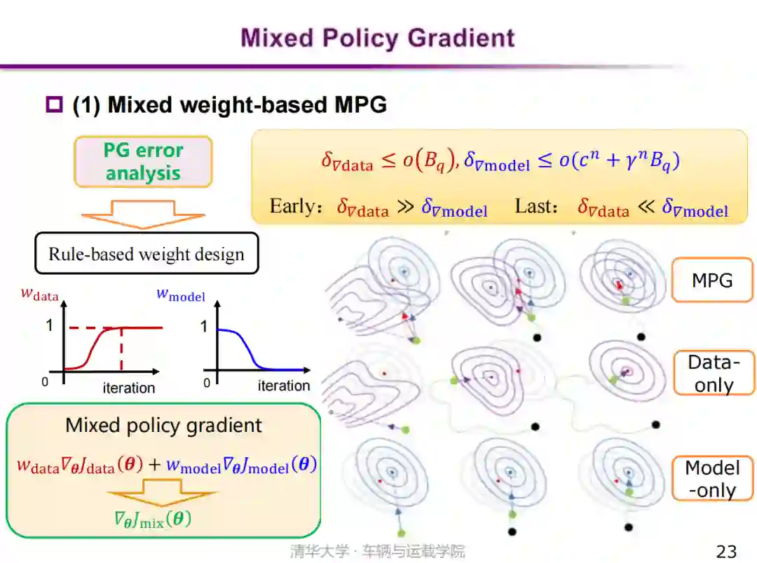 融合的思路是将数据驱动型和模型驱动型策略梯度进行加权融合,即:先分别计算基于数据的策略梯度和基于模型的策略梯度,然后再将两者进行加权。这一方法的关键之处是什么呢?答案是如何更好地选择权重,这是MPG算法的核心难题。从原理上说,最优加权的关键在于数据与模型二者的梯度误差分析。到底更加偏向数据,还是更加偏向模型,取决于谁的误差更小一些。