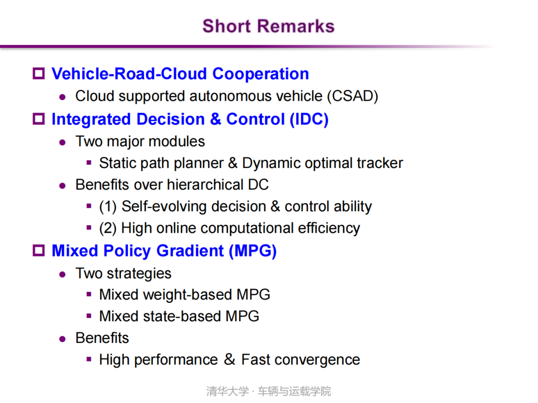 2022年北京智源大会自动驾驶论坛,清华大学车辆与运载学院李升波教授分享了题为《混合型强化学习及其高级别自动驾驶应用》的主题报告。该报告主要探讨了如何将强化学习应用于自动驾驶汽车的问题,目标是让自动驾驶汽车具备自我学习、自我进化的能力,即与人类驾驶员的开车学习过程类似,达到越学越好、越开越好的特点。该报告首先介绍了自动驾驶与强化学习结合的必要性,分析了现有强化学习算法的特点与不足,介绍了所提出的集成式决控(IDC)架构和混合策略梯度(MPG)算法,最后以实车测试结果为例,介绍了这一技术方案应用过程的成功经验与下一步发展方向。