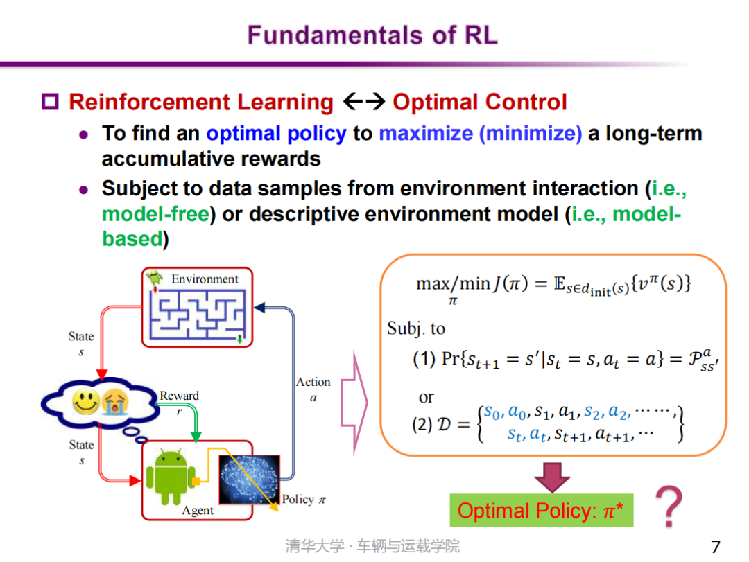 那么什么是强化学习呢?强化学习是一种模仿动物学习行为的自学习决策方法。研究表明:动物(包括人类)是通过不断地探索试错进行学习的,尽量重复带来奖励的行为,尽量避免产生惩罚的行为。实际上强化学习与最优控制是具有密切关联性的,强化学习是寻找最优策略、最大化未来累积奖励的过程,它与最优控制存在本质上的关联性。因此,我们可以将强化学习视作一个最优控制问题,只不过强化学习大多处理随机性环境,而传统的最优控制大多处理确定性环境。按照这一思想,依据强化学习是否使用环境动力学模型,分为带模型(model-based)和无模型(model-free)两类方法。