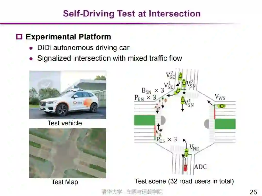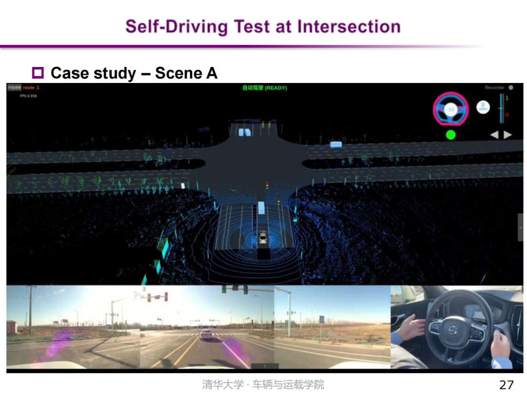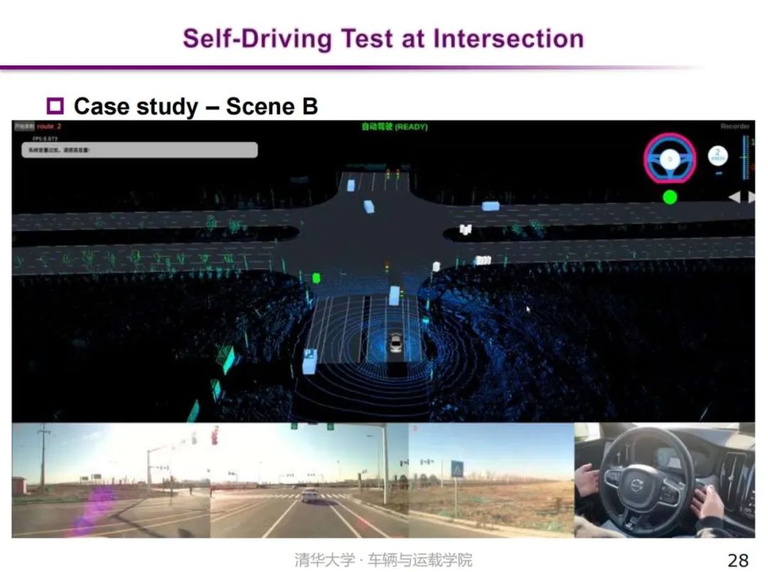 自动驾驶策略的训练系统采用云服务器平台,结合驾驶数据和车路模型对神经网络策略进行训练,训练成功的神经网络通过OTA机制下载到车端应用。实车实验场景是半开放道路的双向八车道信控交叉路口,配置了真实交通流,包括机动车、行人与非机动车。所谓的“半”开放道路是指:为了保证试验过程的安全性,周围的机动车、行人和自行车是真实的,由实验人员驾驶或者扮演,并非完全是与试验无关的外部人员。根据交通流、信号灯、驾驶任务、通行关系的不同,设计了32种交通场景,以此验证IDC架构以及神经网络策略对不同场景的适应能力。下面将展示两个场景的自动驾驶过程。