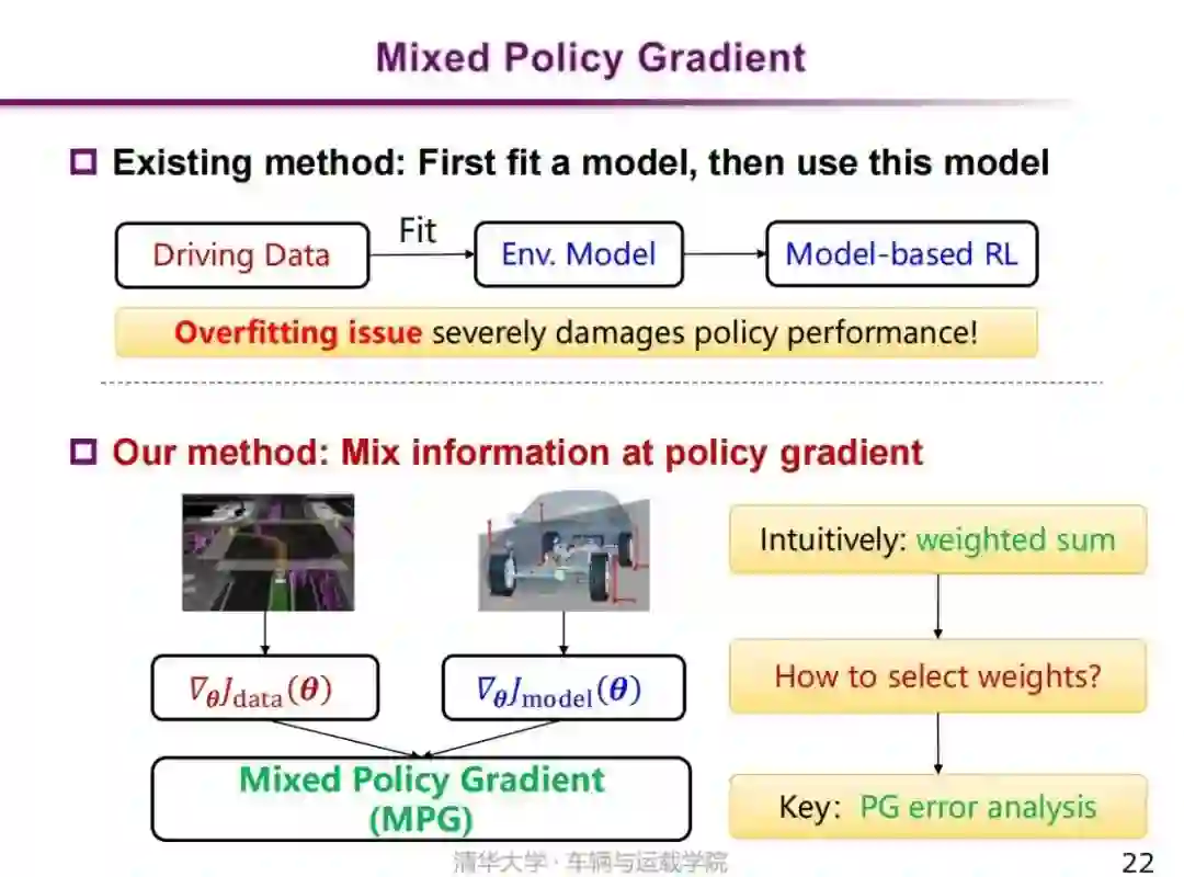 这一做法的问题在于:由于数据的局部性,模型可能存在严重过拟合,从而损害策略性能。为此,我所在的课题组提出了一类全新的混合策略梯度(MPG,Mixed Policy Gradient)算法,核心思路是使用数据和模型直接构造更优的策略梯度估计,即在梯度层面融合模型和数据两部分信息。