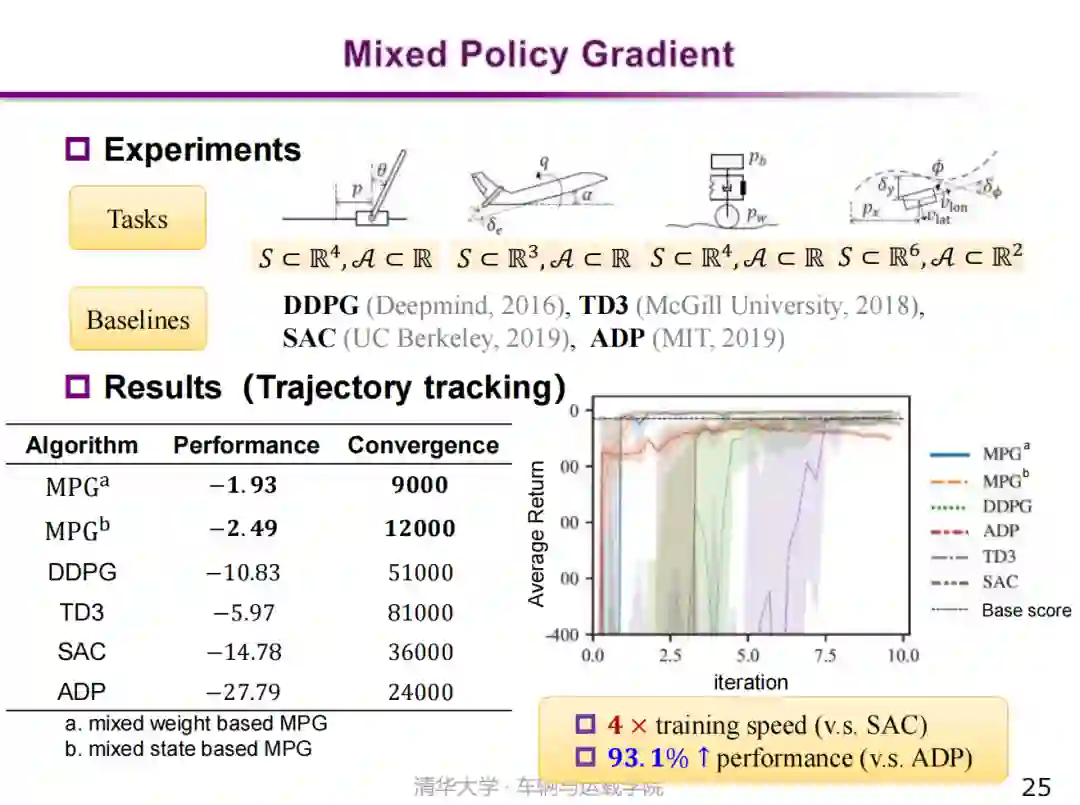 为了验证所提出的MPG算法性能,以飞行器控制与自动驾驶轨迹跟踪为例子,进行典型控制任务的对比验证。对比的基准算法包括DDPG、TD3、SAC、ADP,这些都是强化学习领域具有代表性的优势算法。与基准算法的对比表明,MPG几乎在所有测试任务上均实现了收敛速度与渐近性能的同步提升。以自动驾驶汽车的轨迹跟踪任务为例,与SAC算法相比,求解速度提升了近4倍;与ADP算法相比,策略最优性能提升了93.1%。这些对比案例表明,利用MPG算法可以极大提升自动驾驶决控策略的训练性能,这为自动驾驶汽车的集成式决控策略训练奠定了基础。