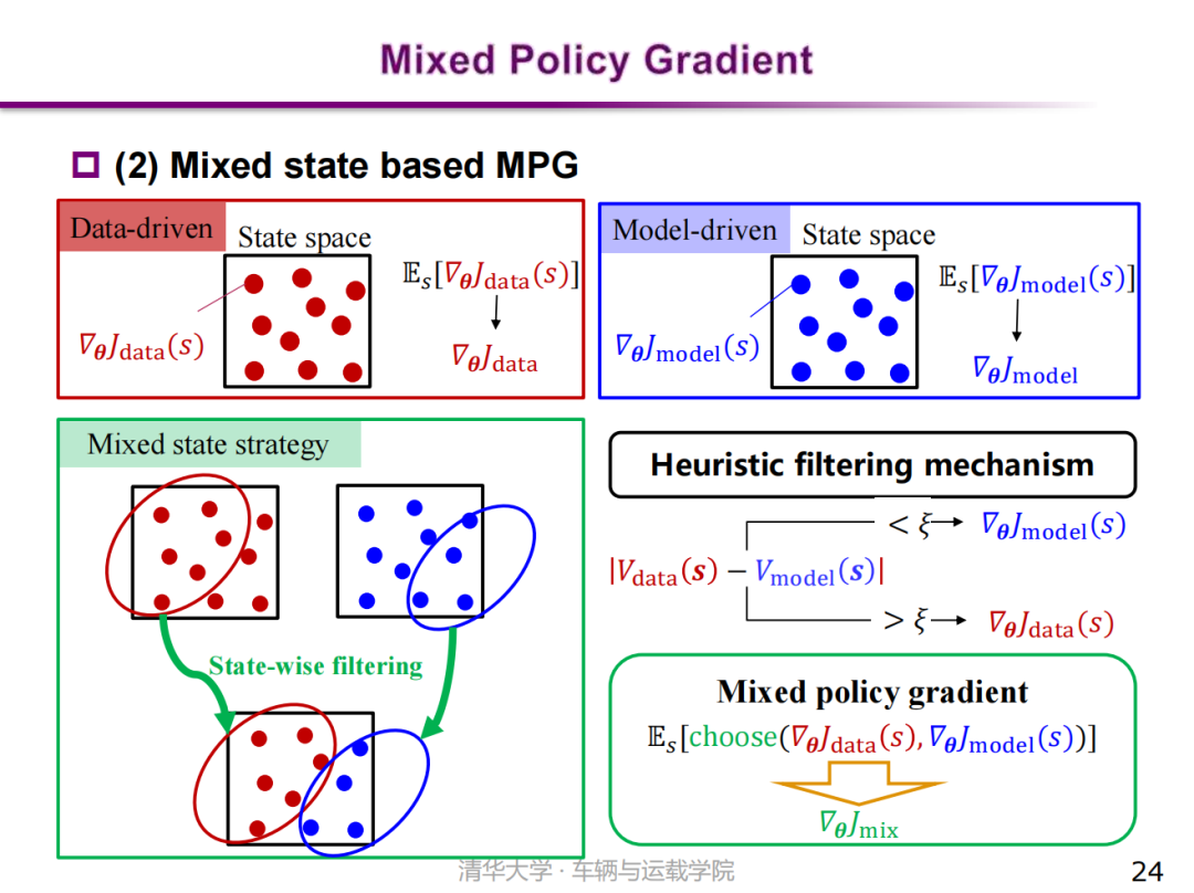 第二类机制,即状态层面的系数选择,则从策略梯度的数学形式入手。不论数据驱动型或者模型驱动型的策略梯度,其形式都是状态空间下每个点的梯度的期望。因为数据或模型可能分别在某些点下具有更好的梯度估计,状态层面的系数选择希望设计一种筛选机制,实现状态空间划分,使其中一部分状态使用数据驱动型的策略梯度,另一部分使用模型驱动型的策略梯度。