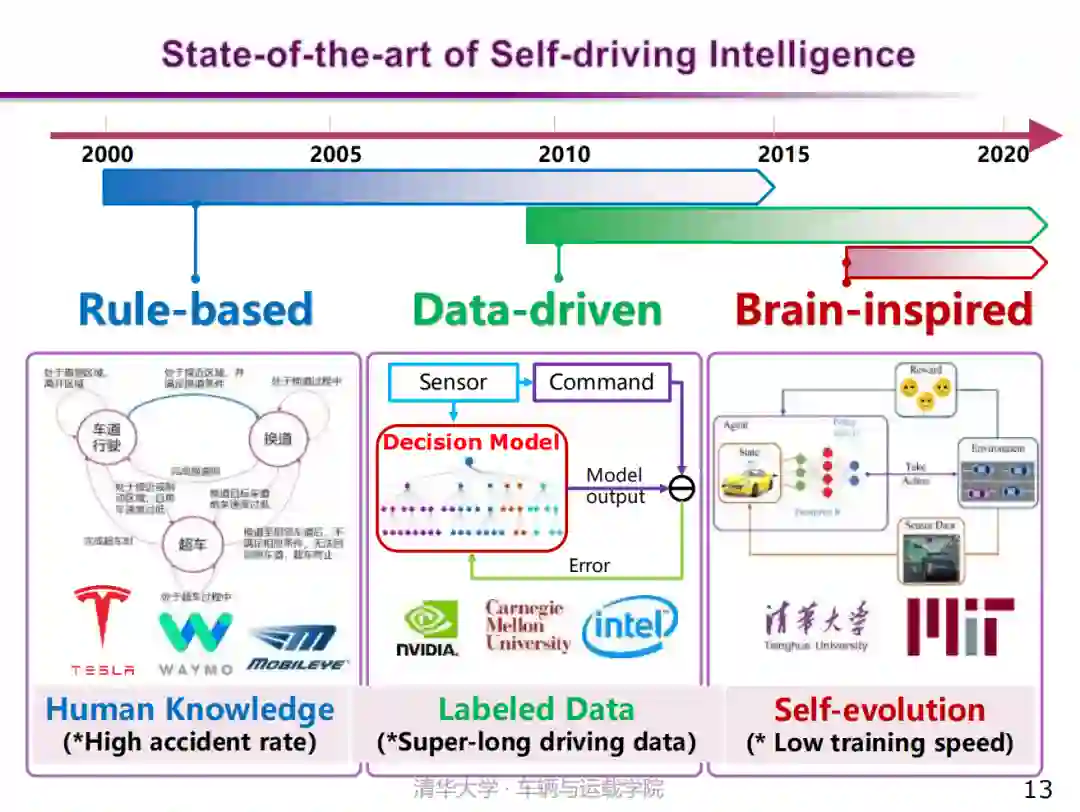 单独从决策控制功能看,自动驾驶决控系统共历经了三代技术变革,分别是以谷歌、特斯拉为代表的专家规则型决控,以英伟达、CMU为代表的数据驱动型决控,以及以MIT和清华大学为代表的类脑学习型决控。