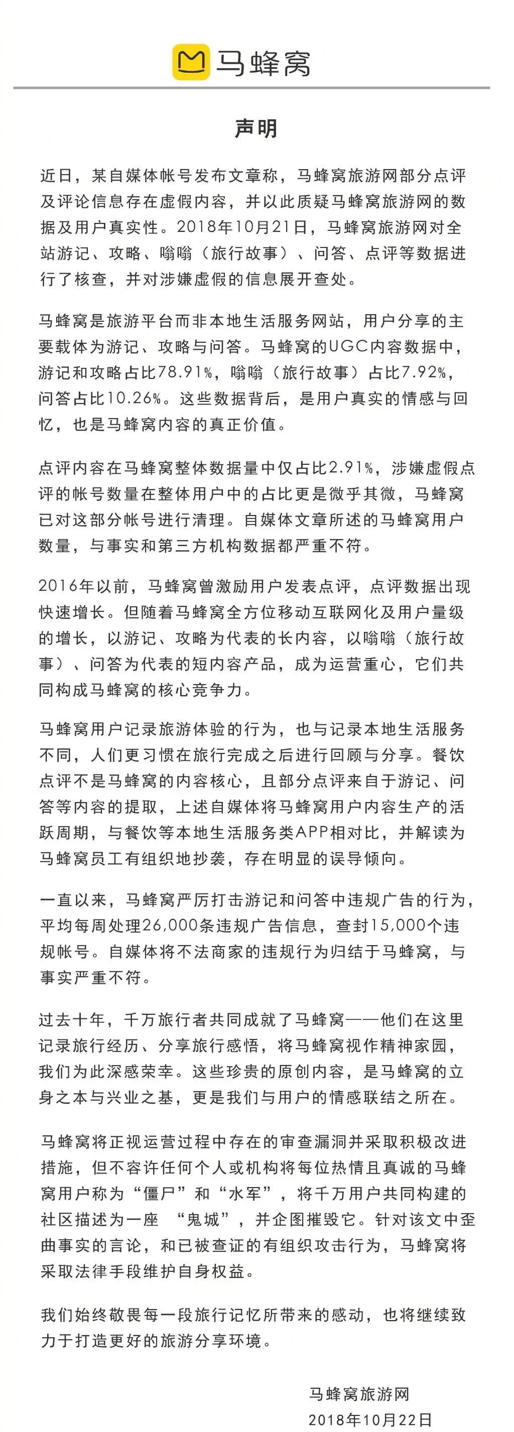 22日早上,马蜂窝也随即发布了声明,表示会对涉嫌虚假的信息,进行查处。