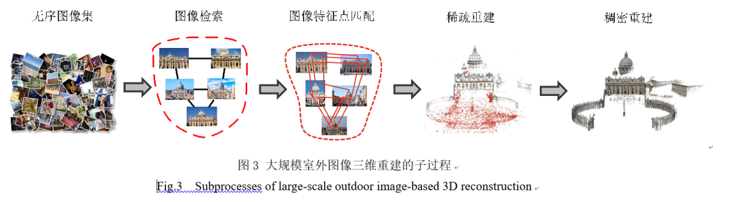 对于人类而言,通过视觉构建真实、准确、完整的三维模型是自然而然的事,但是在计算机程序中抽象出该过程却绝非易事。为了使大规模图像三维重建在计算机程序中可行,通用的方法是将重建分解为几个更小、更易处理的串行子过程。本文重点关注这些子过程中点云生成部分,如图3所示。对于后续的表面重建和纹理映射,本文不进行具体阐述。