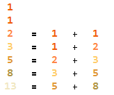 一开始的题目“1, 1, 2, 3, 5, 8, 13, ... ”是斐波那契数列。1, 1 后面的数字是将前两个数字相加,所得的和成为接下来的数字。