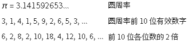 米尔嘉在出“6, 2, 8, 2”这道题时,为什么不单单说“6, 2, 8, 2”,还一直说到“6, 2, 8, 2, 10, 18”呢?那是因为如果她只说“6, 2, 8, 2”的话,我们无法发现其中的规律其实是圆周率 π 的各位数字的 2 倍。我们还可能得出其他简单的答案。假设题目只是“6, 2, 8, 2, 10, ... ”的话,我们还可能联想到以下数列。