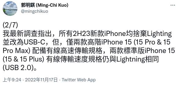 郭明錤今日就爆料称,明年的 iPhone 15 将全系换上 USB-C 接口。此前有不少人认为,iPhone 会先在高端的 Pro 机型上采用 USB-C 接口,标准版则会继续用 Lightning,一路拖到法规生效。