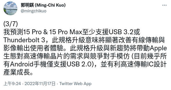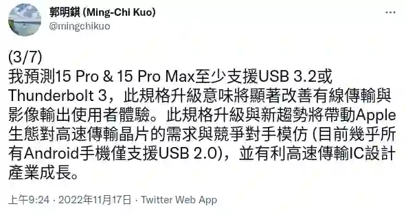 此外,更高端的 iPhone 15 Pro、Pro Max 规格也会更强,至少达到 USB 3.2 甚至雷电 3 的水平。