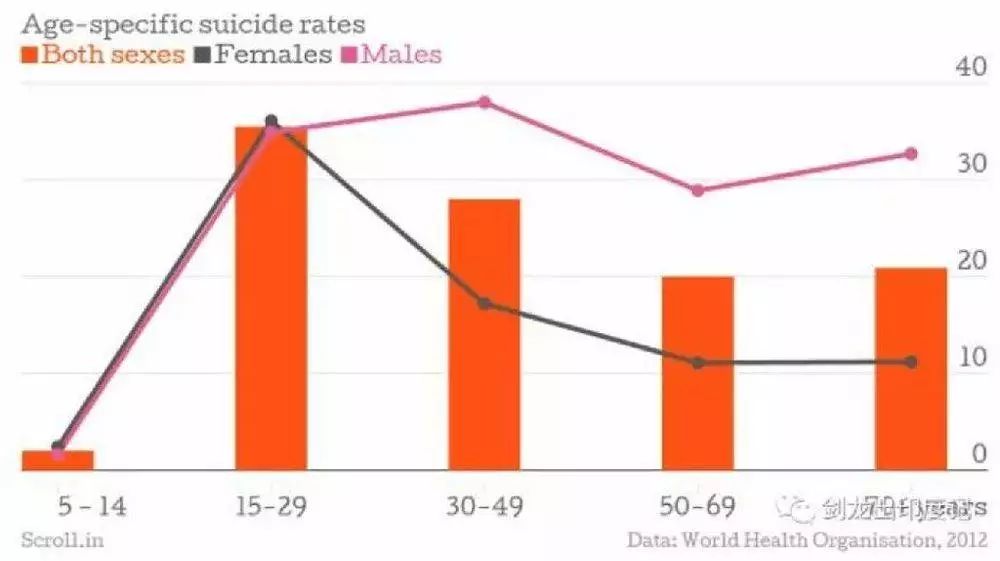 15岁至29岁的印度年轻人,其自杀率居全世界前列。2013年,每十万人中,就有30到40人自杀,占到所有自杀人群的三分之一。