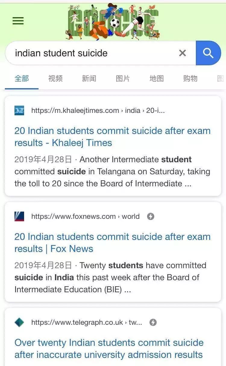 现在,每一个小时,就有一名印度学生自杀。谷歌上搜索“印度学生自杀”,几乎所有的结果都是因为考试不佳而诱发,每年的五六月份,也是学生自杀的高峰季。