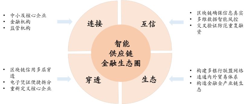 以金融科技驱动的智能供应链金融平台,具有智能在线连接多方打破信息孤岛、智能互信交叉多维验证确保链上企业资质与数据真实可信、智能穿透实现核心企业“信用流+资金流”多级分享和可控、智能生态实现不同企业供应链的跨链共享防范风险。依托这四大特点,构建起全新的智能供应链金融生态圈。