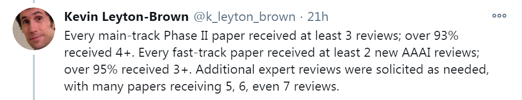 每篇主track的第二阶段的论文都至少收到3篇评审;超过93%的论文获得4+分。每篇快速track论文都至少收到两篇新的AAAI评审;超过95%的人获得3+的评审。根据需要还征集了其他专家评审,许多论文获得了5条6条,甚至7条评审。