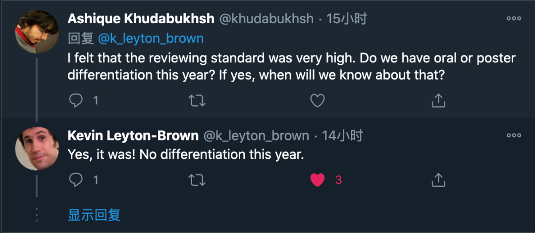 对于这一问题,推特上有热心网友问到了AAAI 2021大会程序主席Kevin:“感觉今年评审标准提高了,今年还会有oral或poster等级的划分吗?”