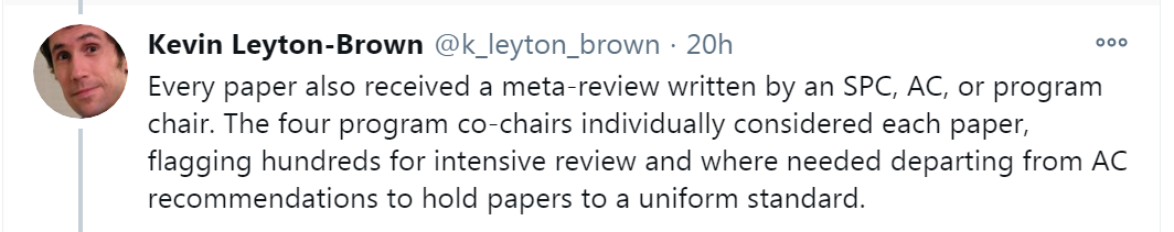 每篇论文还接受了由SPC,AC或程序主席撰写的meta-review。四位共同的程序主席独立审核了每篇论文,并标记了数百篇论文进行深入审核,并在评审偏离AC建议时,去除AC影响,以使论文保持统一的标准。