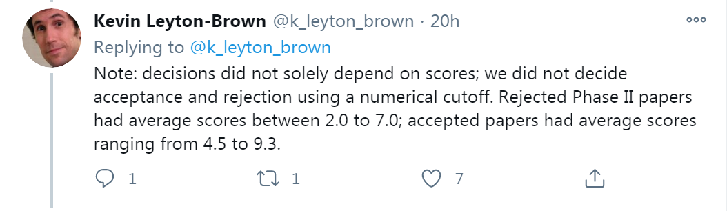 决定不仅仅取决于分数。我们没有使用数字临界值来决定接收或拒绝。被拒绝的第二阶段论文的平均分数在2.0到7.0之间,被接受的论文的平均分数在4.5到9.3之间。
