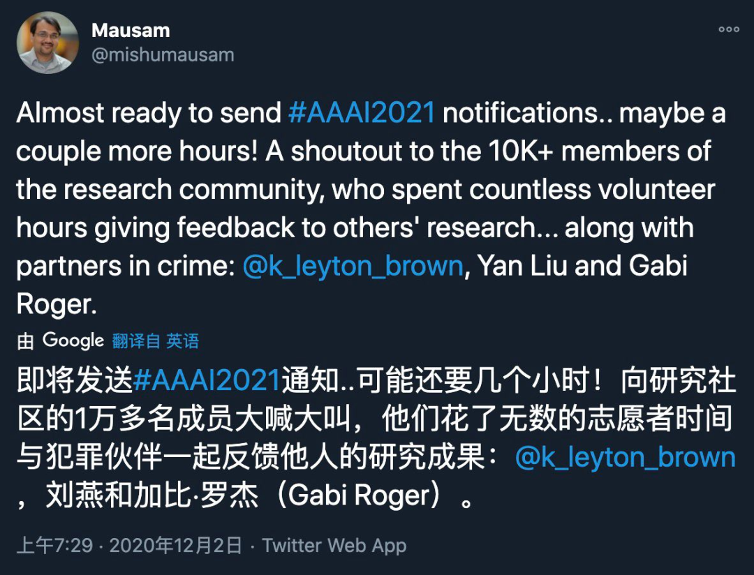 时间回到一天多前,按照AAAI之前官网的显示,大会应该在12月1日就应该发送录取邮件通知,而直到12月2日,大会的另一位程序主席Mausam才在推特上发文称还要等上几个小时。