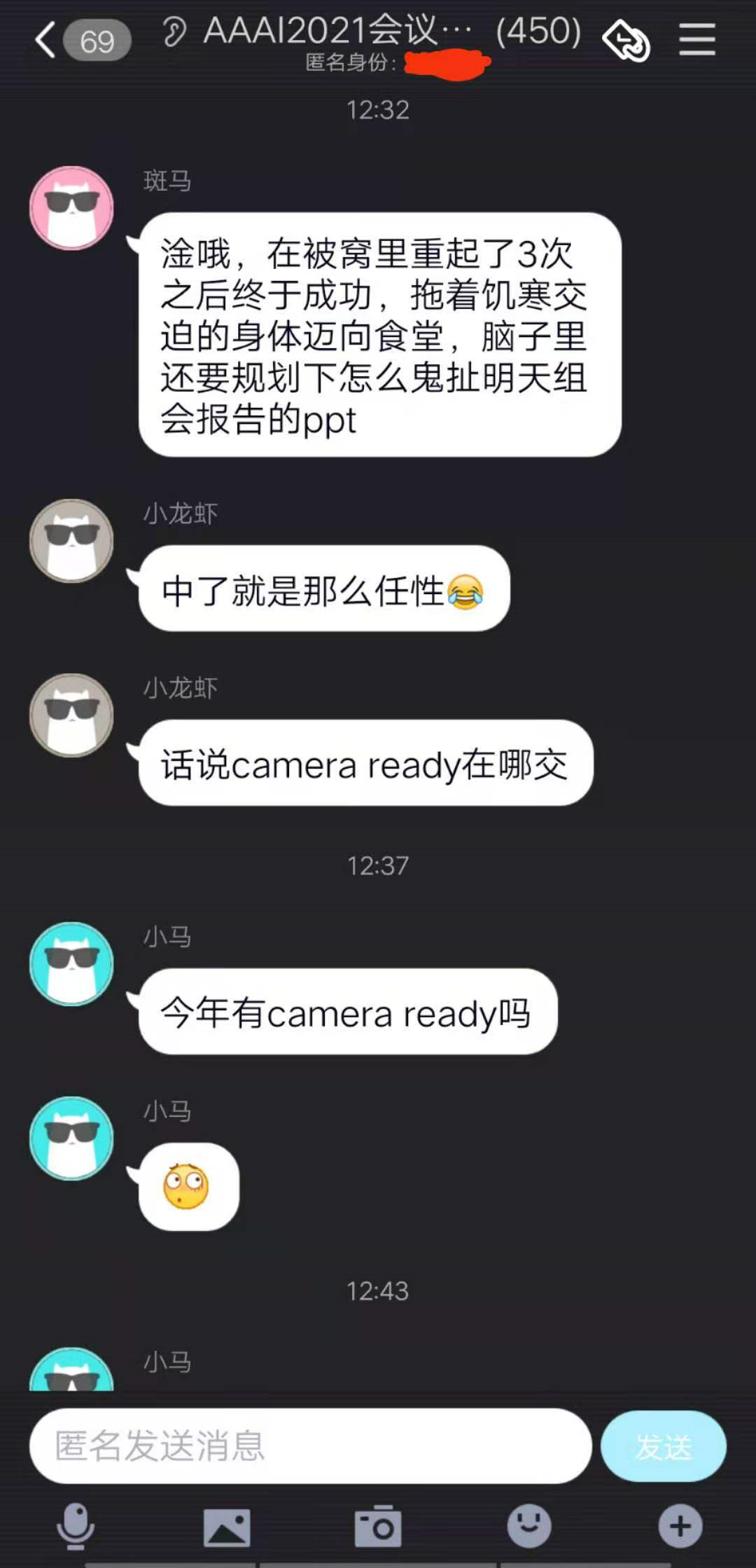 这样的事情当然不只是发生在reddit上,在本土的QQ群上,有个AAAI 2021会议投稿450人匿名交流群:
