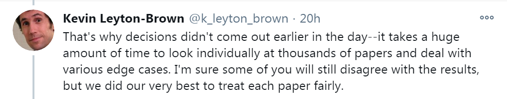 这也是为什么我们没有在当天早些时候做出论文录用决定的原因:我们花费大量时间单独查看数千篇论文并处理各种极端情况。我敢肯定,你们中的一些人仍然会不同意录用结果,但是我们竭尽所能公平对待每篇论文。