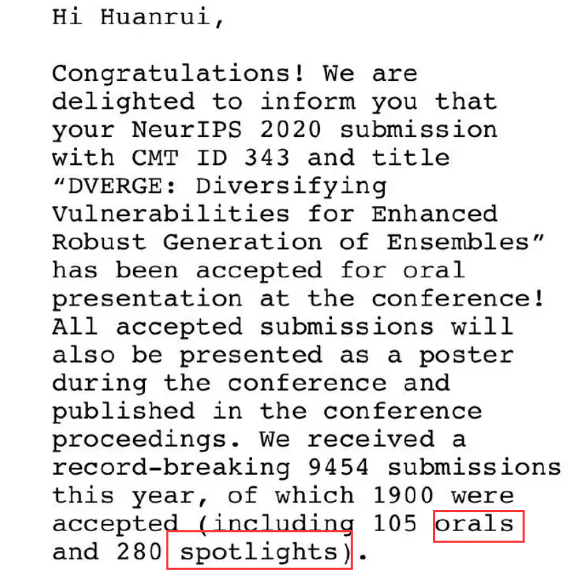 不同于以往AI顶会的录取通知邮件(有Oral、Spotlight等级划分),如下图所示: