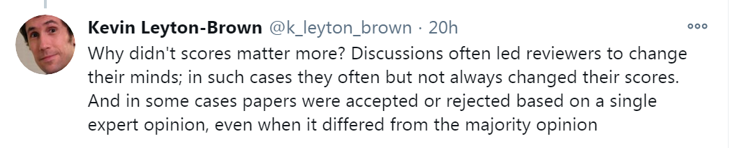 为什么分数并不重要?因为讨论经常导致审稿人改变主意;在这种情况下,他们经常改变分数。在某些情况下,即使是与多数意见不同,论文也只能基于一位专家意见被接收或拒绝。