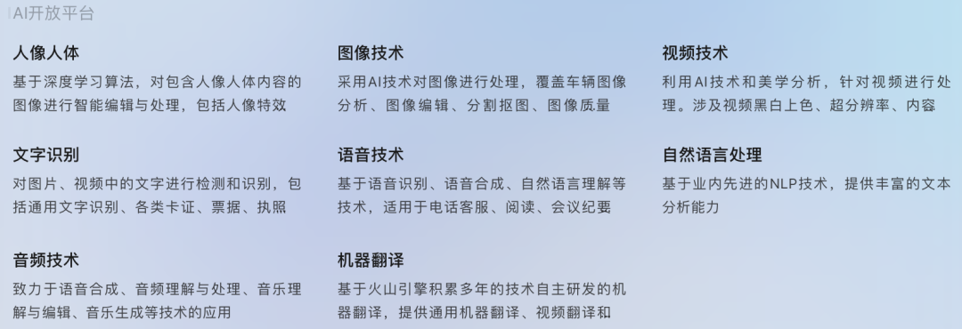 那么,有了这些字节跳动在AI技术上的深耕,火山引擎AI开放平台的能力自然也有了强力的保障。