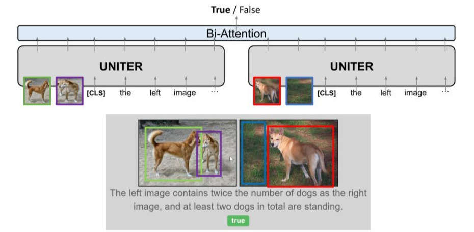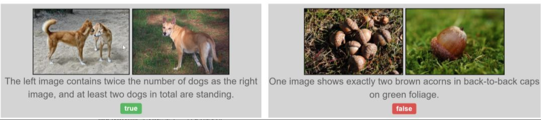 NLVR(Natural Language for Visual Reasoning)任务中,需要同时输入两张 Image 和一个描述,输出是描述与 Image 的对应关系是否一致,label 只有两种(true/false)。